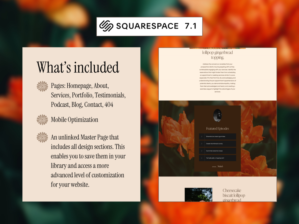 Pages: Homepage, About, Services, Portfolio, Testimonials, Podcast, Blog, Contact, 404 | Mobile Optimization: This Squarespace website template looks and works perfectly on mobile devices. | Design Library: You will see two unliked pages (one for page headers and other for regular sections) in your site panel with all the layouts included in pages and even new ones. | Important information: Inside your website youโll see an unlinked page with important information for the use of your Squarespace website. | Support: If you encounter any technical issues, or have questions you can send us a message and weโll be happy to help.